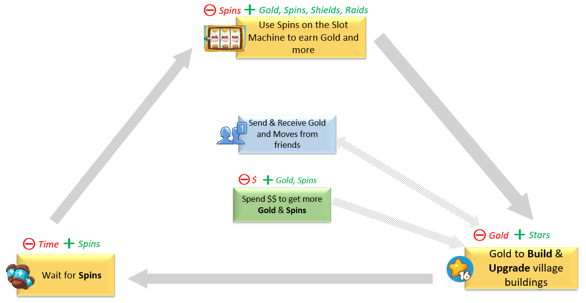 The core loop depicts the economy of the game, showing how resources are generated and where they are spent. The soft currency in this game is Coins which you earn by spinning the wheel. You get 5 Spins every hour and can usually hold a maximum of 50.