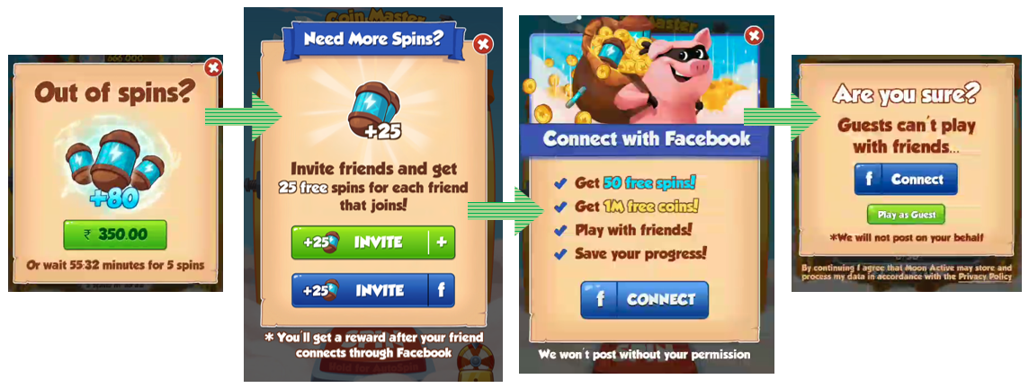 Coin Master, like any slots game, deploys a strategy of variable rewards to get users hooked. Any spin could be your lucky one! The research says that giving users exactly what they want, will get them less engaged over time. So the app gives users a mix of rewards ranging from meh to OhMyGod!