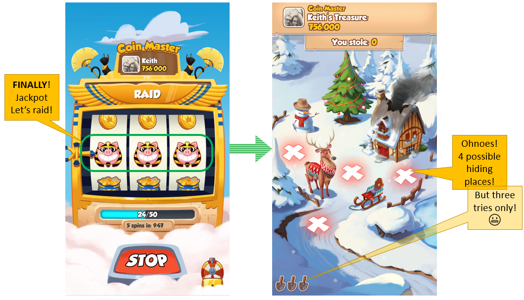 Here is an example: You really need 800k coins to make your next upgrade. Keith (below) has 756k coins up for grabs.. Excellent, this could be your chance! But you really really need for the machine to stop on the "RAID" option - when 3 pigs line up. You spin and pray at the same time. SUCCESS! Let's Raid. You raid, and you've got three tries to get Keith's treasure, but 4 possible locations to search. Of which one will be empty. Oh no, more variable rewards systems.